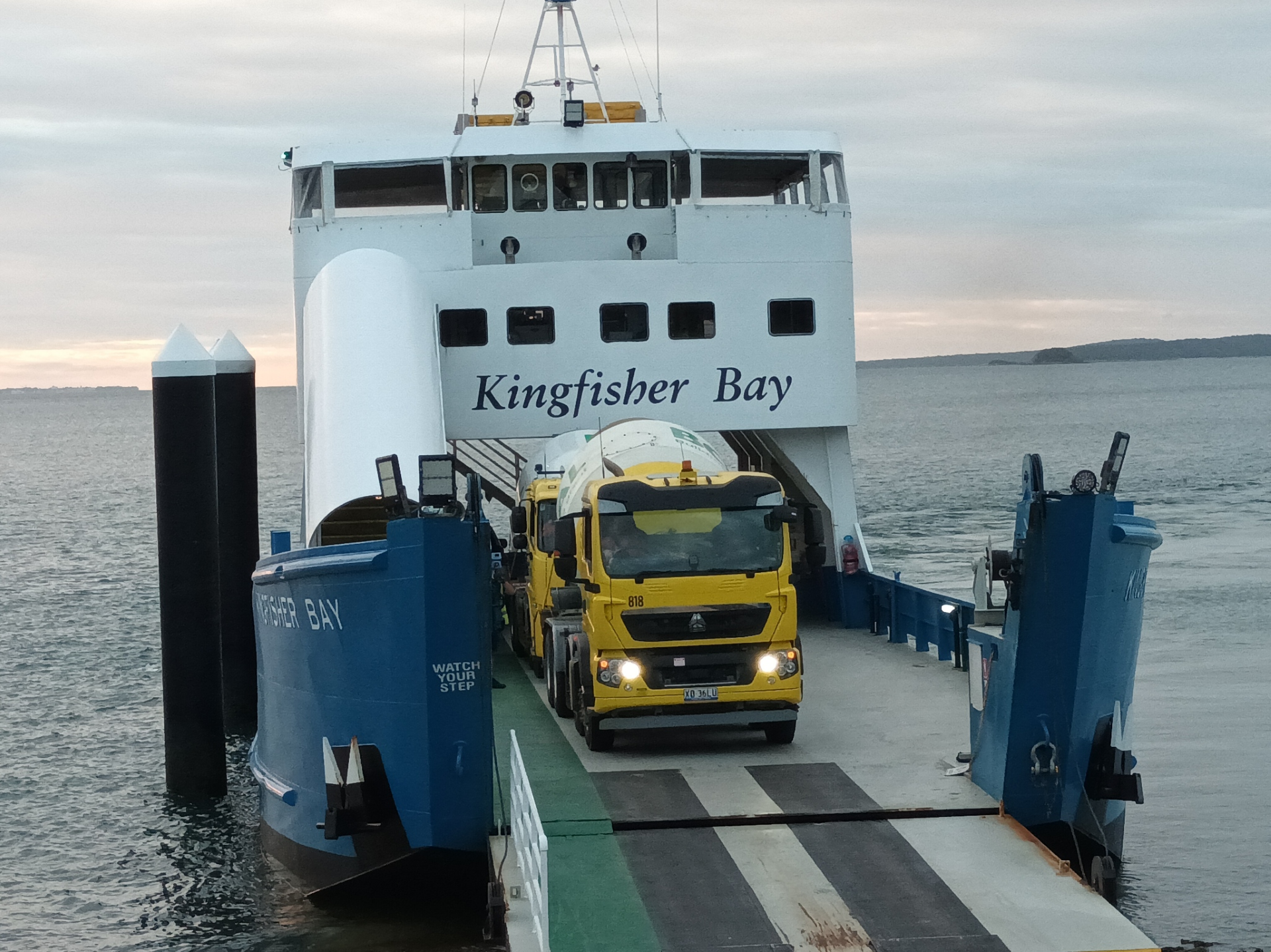 The public barge can only carry two trucks at a time, so a private barge was organised to get our trucks across from River Heads, the mainland departure site for ferries to the island.