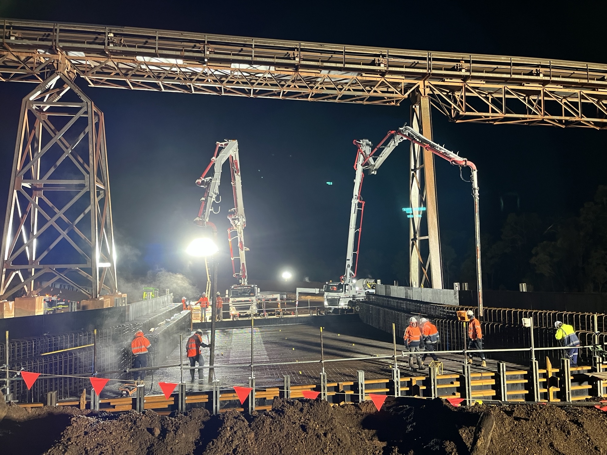 The pour was for South32 Worsley Alumina, where a slab and protective walls were needed around an existing overhead conveyor. The tight site conditions required precision, as haul pack trucks will pass beneath with little room to spare.
